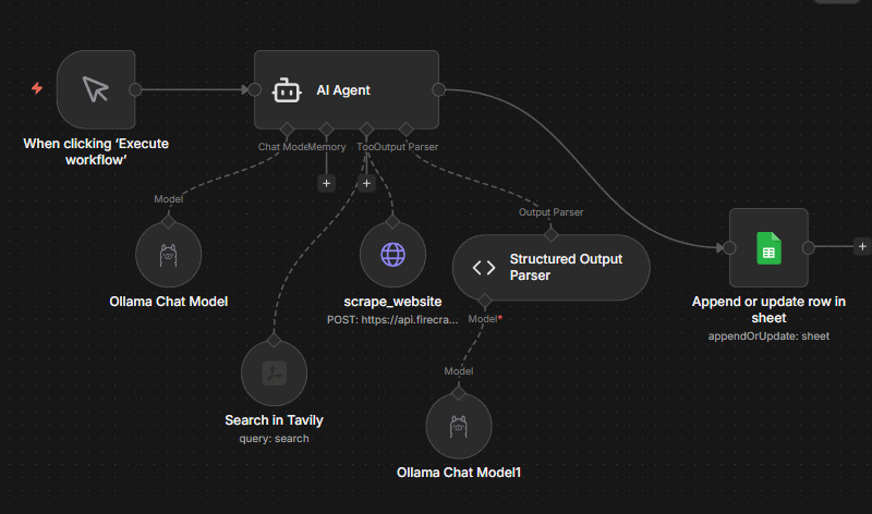 Execution: Click Execute Workflow. Watch the logs as the Agent searches, scrapes, and finally appends your rows. You have now built a professional-grade lead generation machine.