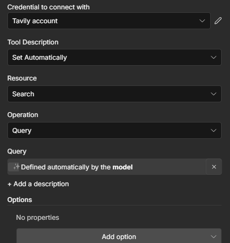 In n8n: Drag a Tavily tool node. Click Select Credential → Create New. Paste your key and name it "Tavily Account."